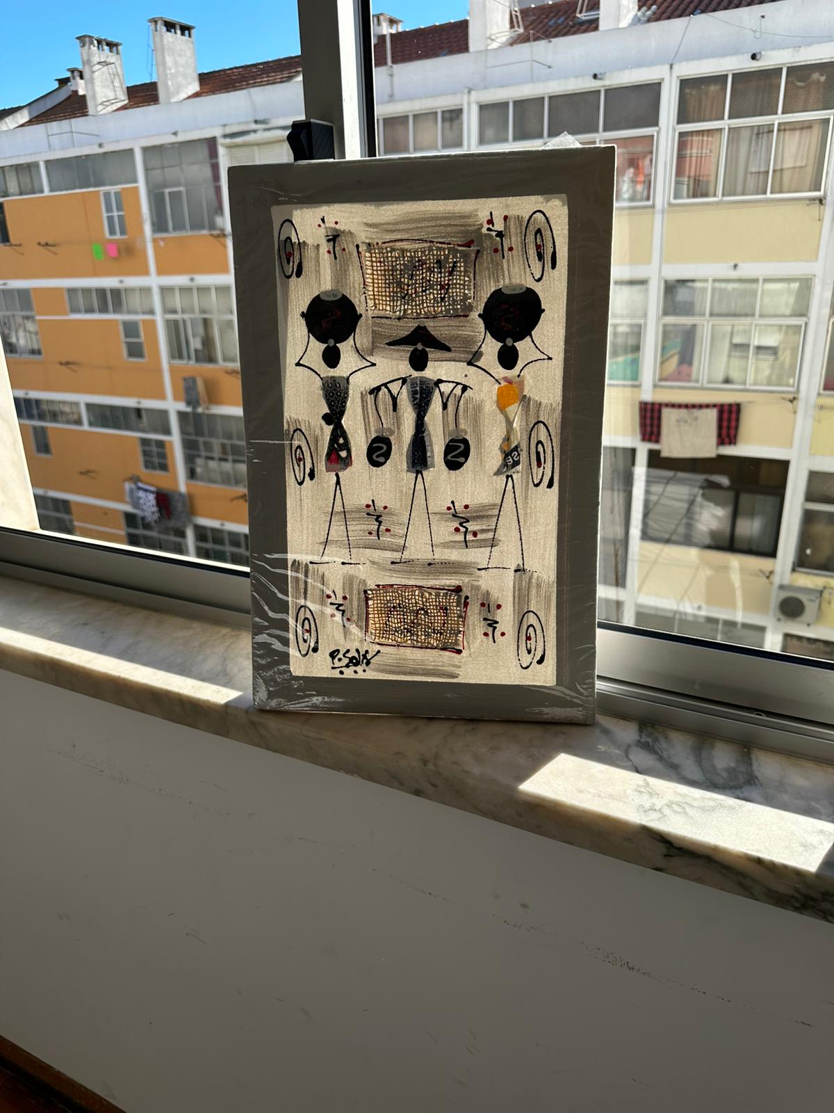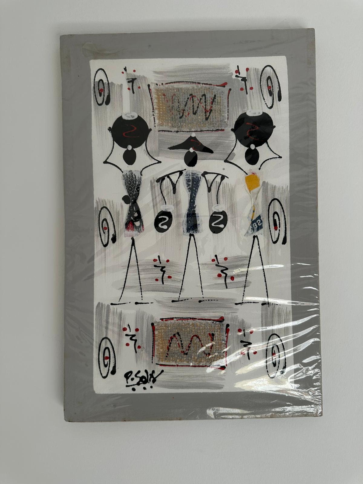 This visually intricate piece combines P. Soli’s familiar human figures with bold patterns and abstract forms. A grayscale color palette accented with red details gives it a contemporary edge while staying deeply connected to African roots.