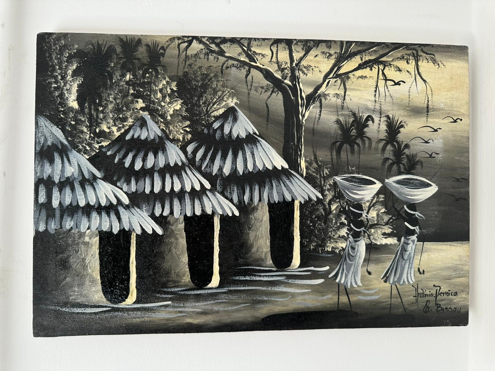 Rendered in earthy tones and graceful detail, this painting portrays a quiet village with stylized huts and women walking gracefully in the foreground. A peaceful homage to African rural life, celebrating the calm dignity of community and culture.