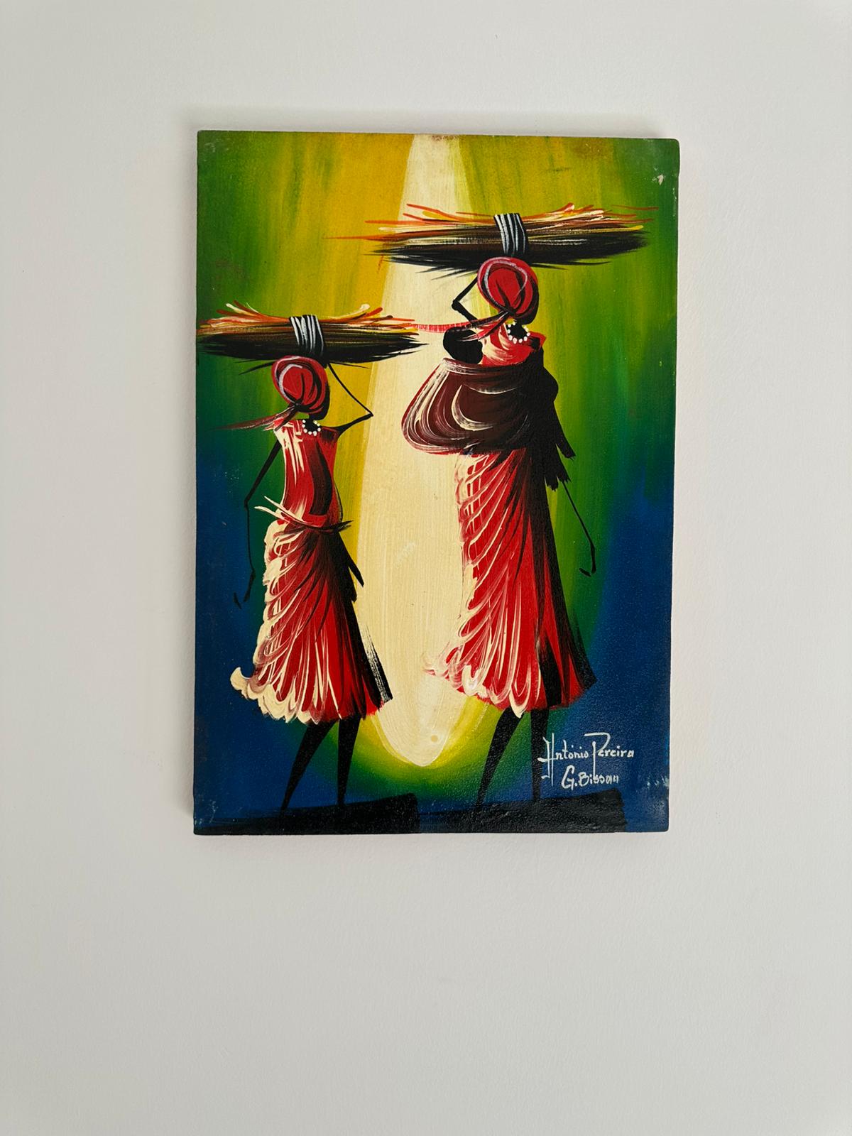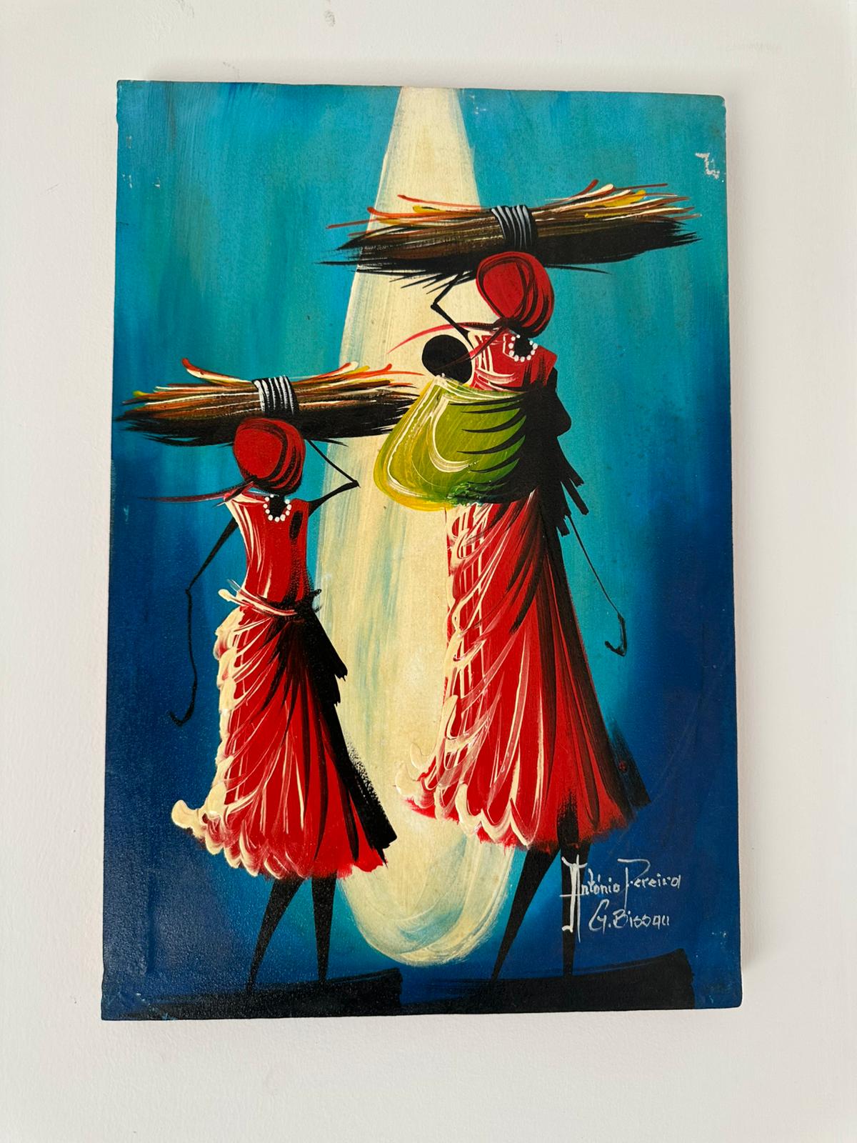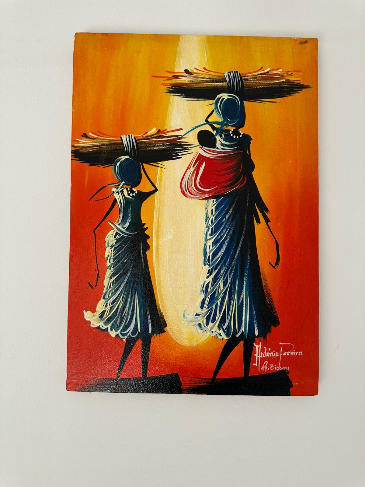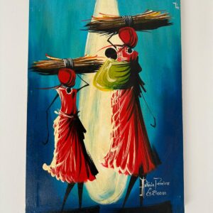 Set against a fiery orange sunset, this painting captures the strength and spirit of two women returning from the day’s labor. Their stylized forms, adorned in soft blue and red wraps, evoke motion and perseverance. The light framing them symbolizes endurance and quiet pride in everyday life.