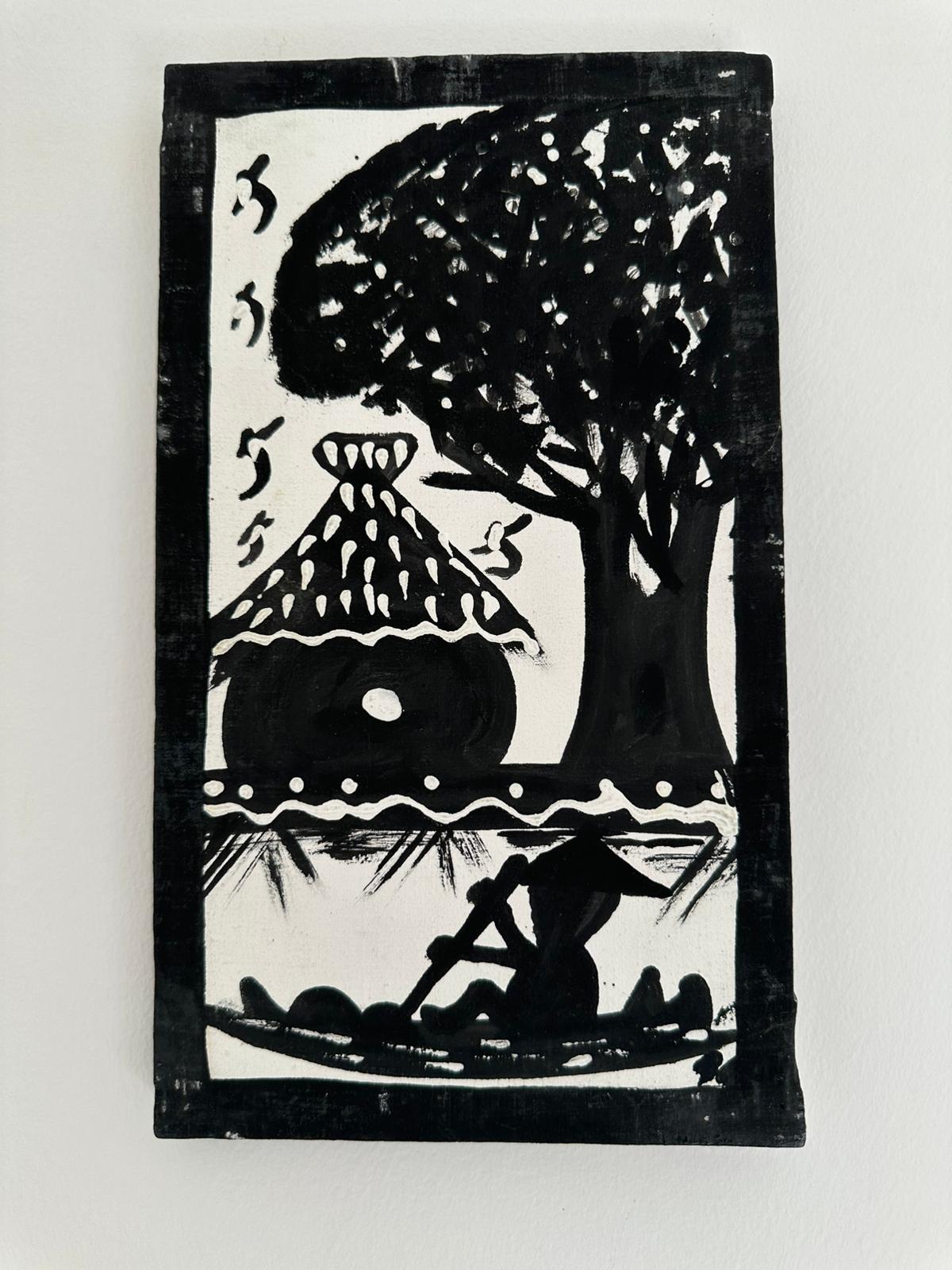 Executed in monochrome tones, this painting uses contrast to stunning effect. The scene shows a person paddling a canoe past a thatched hut and large tree, all reflected in still waters. Simple yet evocative, the art captures the calm rhythm of river life, perfect for minimalist or rustic decor styles.
