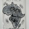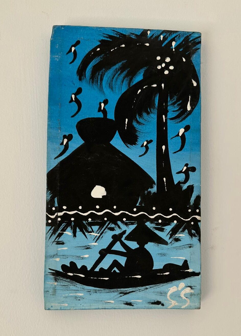 Featuring rich contrasts of blue and black, this captivating artwork evokes peacefulness as a lone figure paddles under a moonlit sky, surrounded by iconic African scenery. The swirling birds and palm tree add to the dreamlike, tropical atmosphere of the piece.
