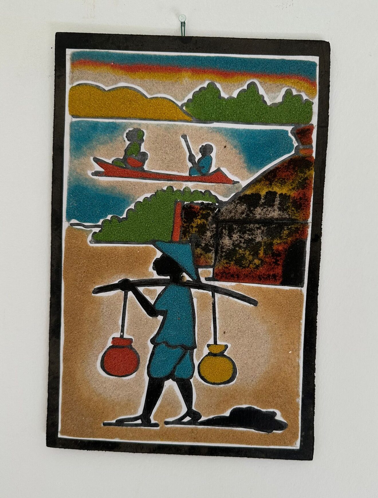 Celebrate the essence of African village life with this colorful sand art showing a man carrying pots and two figures canoeing in a serene river setting.