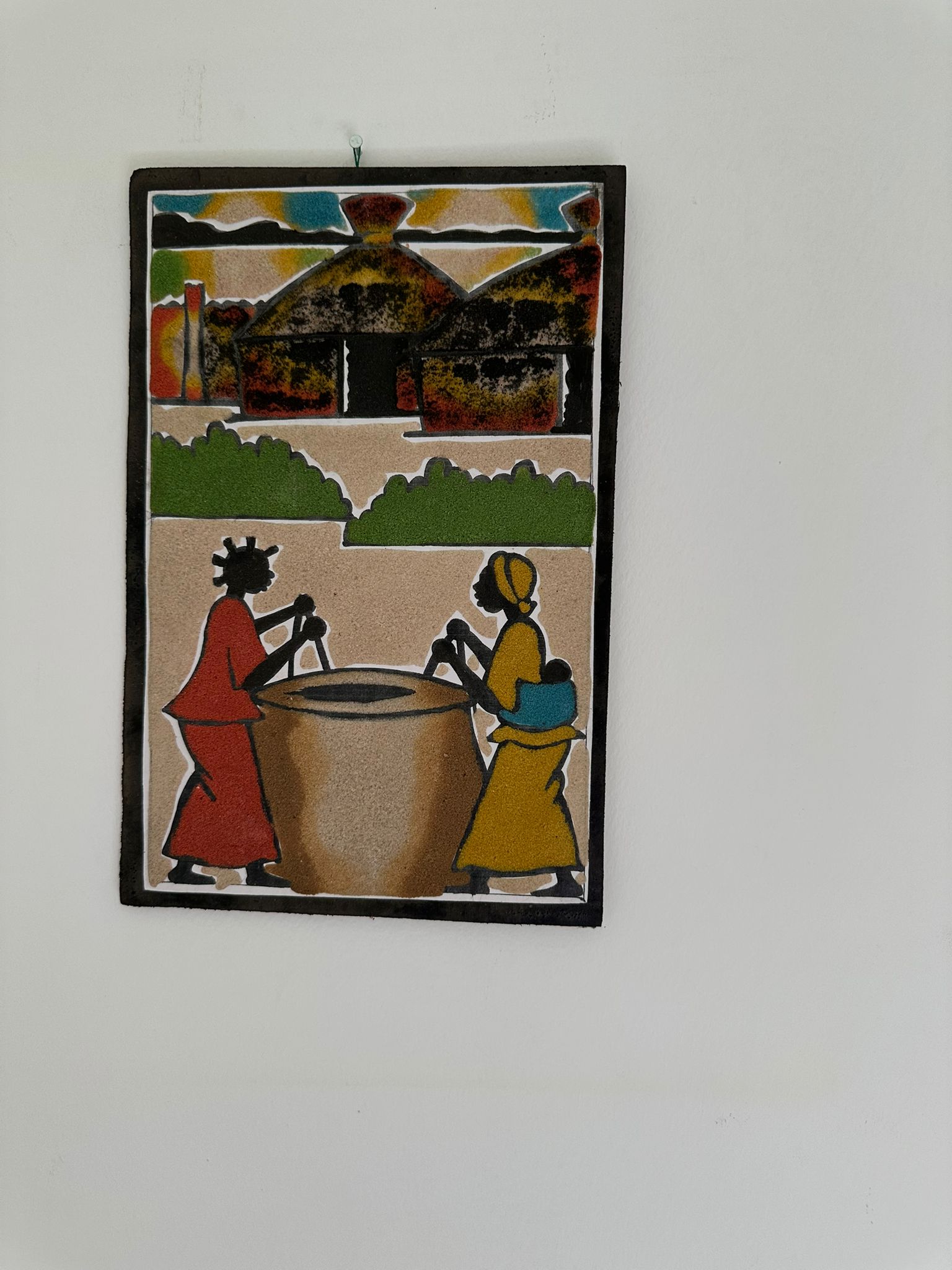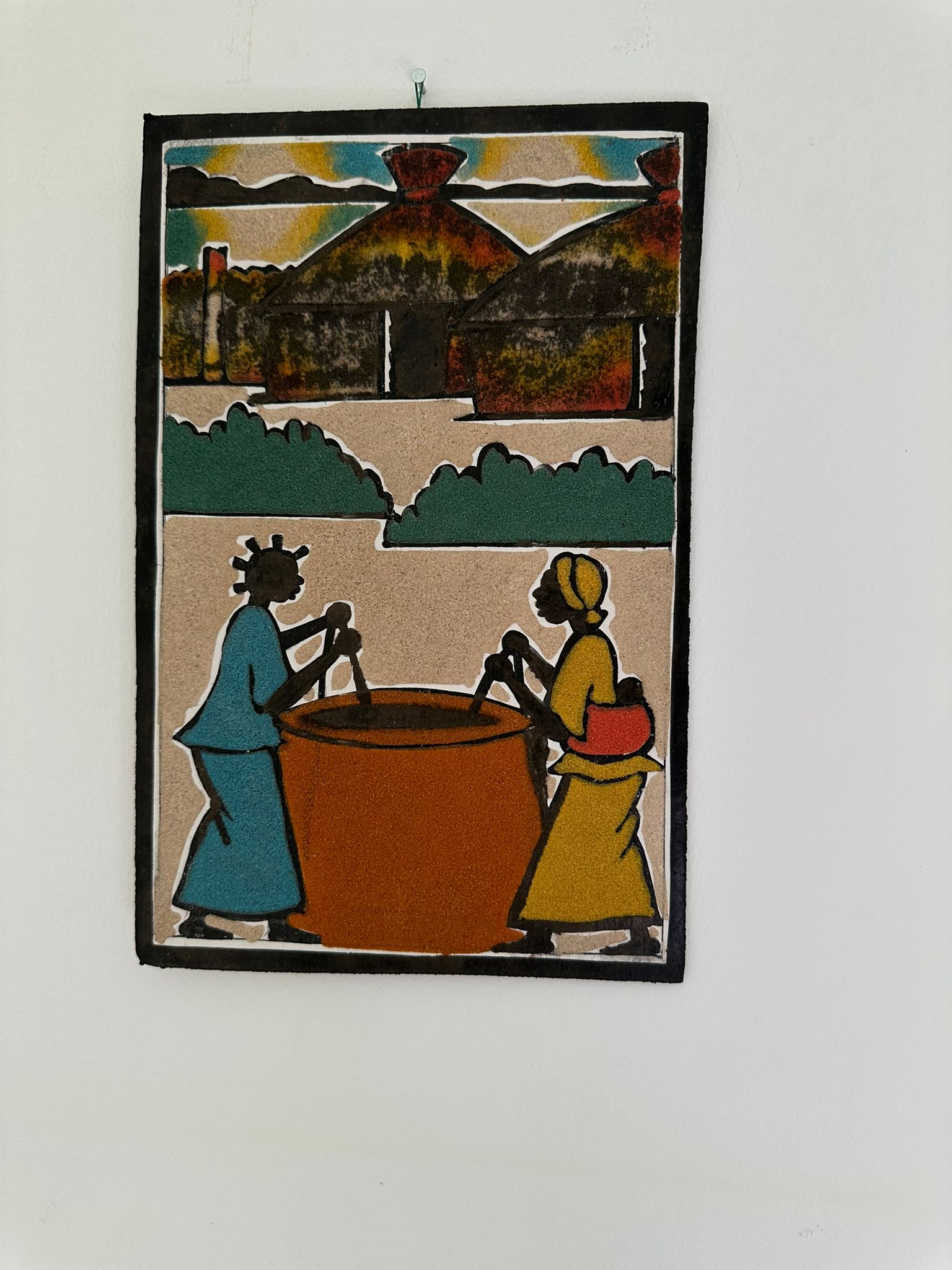 Set in a traditional village with lush greenery and round huts, this sand painting features two women stirring a large cooking vessel. Dressed in vibrant colors and surrounded by nature, they embody the spirit of community gatherings and collective preparation. A perfect piece to honor African hospitality and shared cultural traditions.