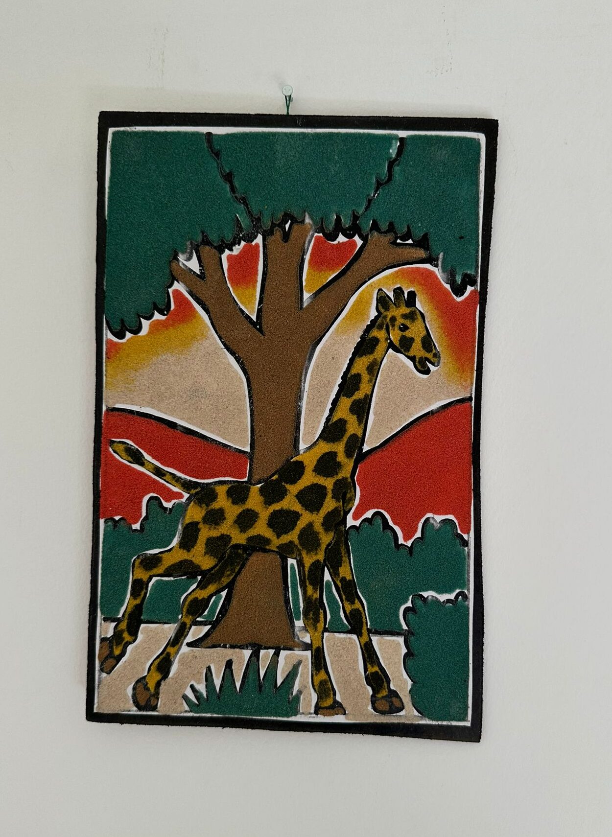 Bring the wild beauty of Africa into your space with this vibrant sand art piece featuring a giraffe walking beneath a tree at sunset. Rich colors and bold lines evoke a sense of movement and warmth.