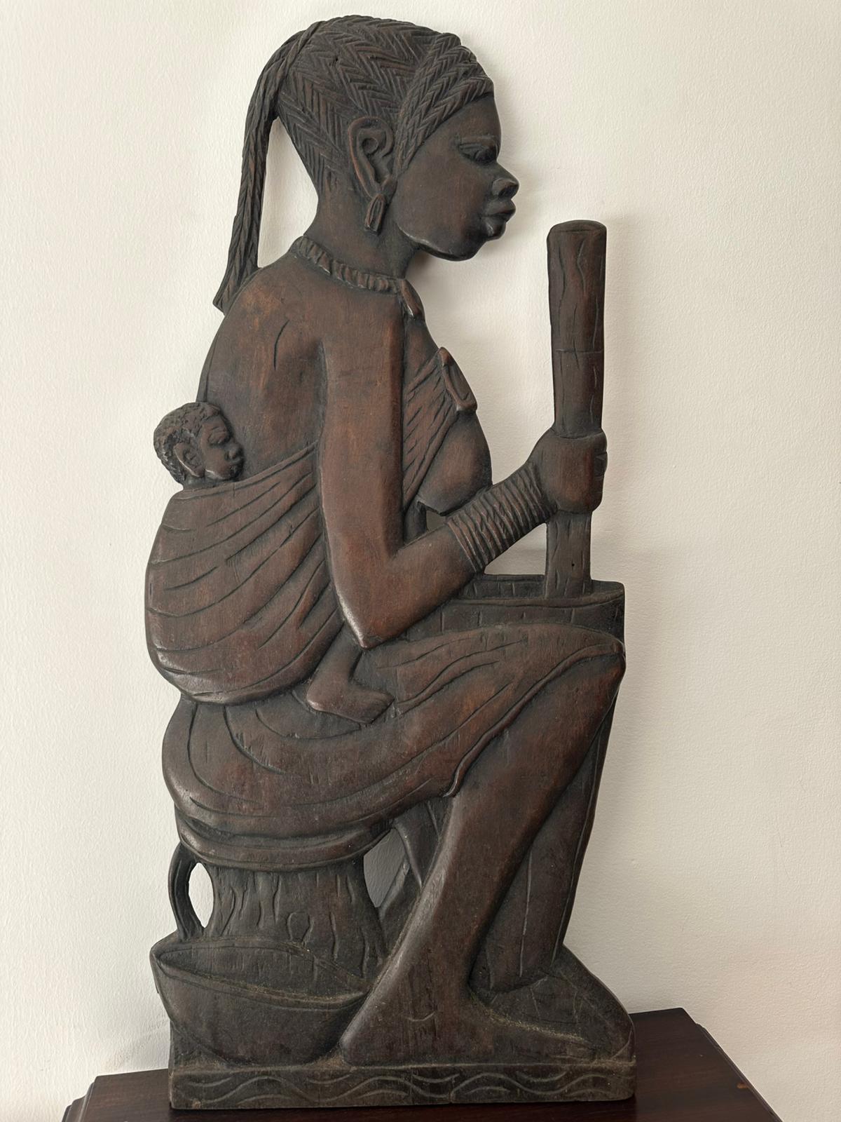 Beautiful wooden carving representing a mother and her baby. Awe-inspiring hand-carved piece perfect for decorating and bringing a sense of culture representation and life into any room.