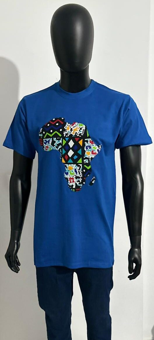 This men’s royal blue T-shirt features a vibrant African continent graphic filled with bold, multicolored traditional prints. Made from soft, breathable cotton, it adds energy and cultural pride to your everyday look.