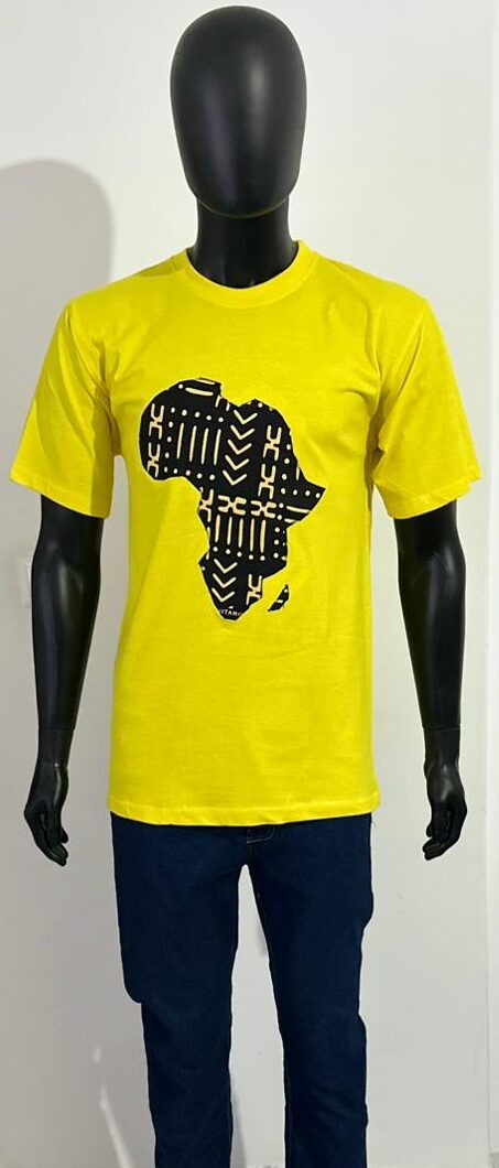 Bold and bright, this men’s yellow T-shirt features a striking black Africa silhouette filled with authentic Mud Cloth-inspired patterns. Crafted from soft cotton, it’s where tradition meets standout street style.
