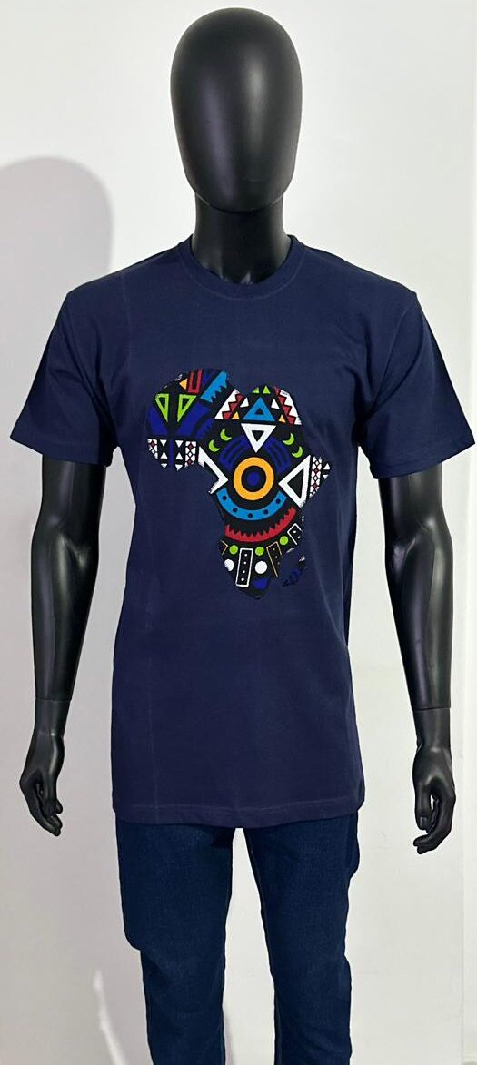 Stand out in this navy blue men’s tee, featuring a vibrant Africa silhouette filled with striking geometric symbols and bold colors. A cultural statement made stylish and comfortable.