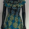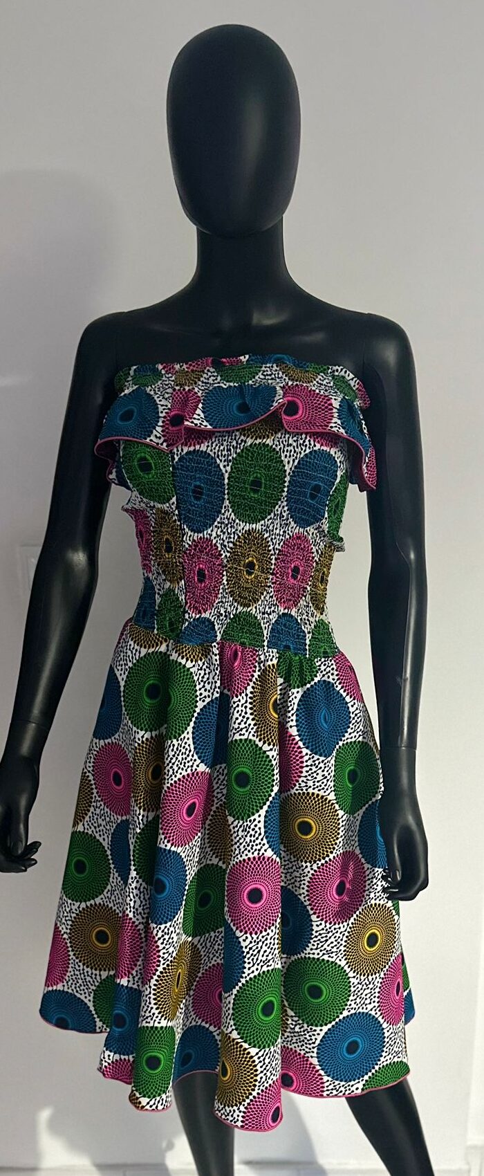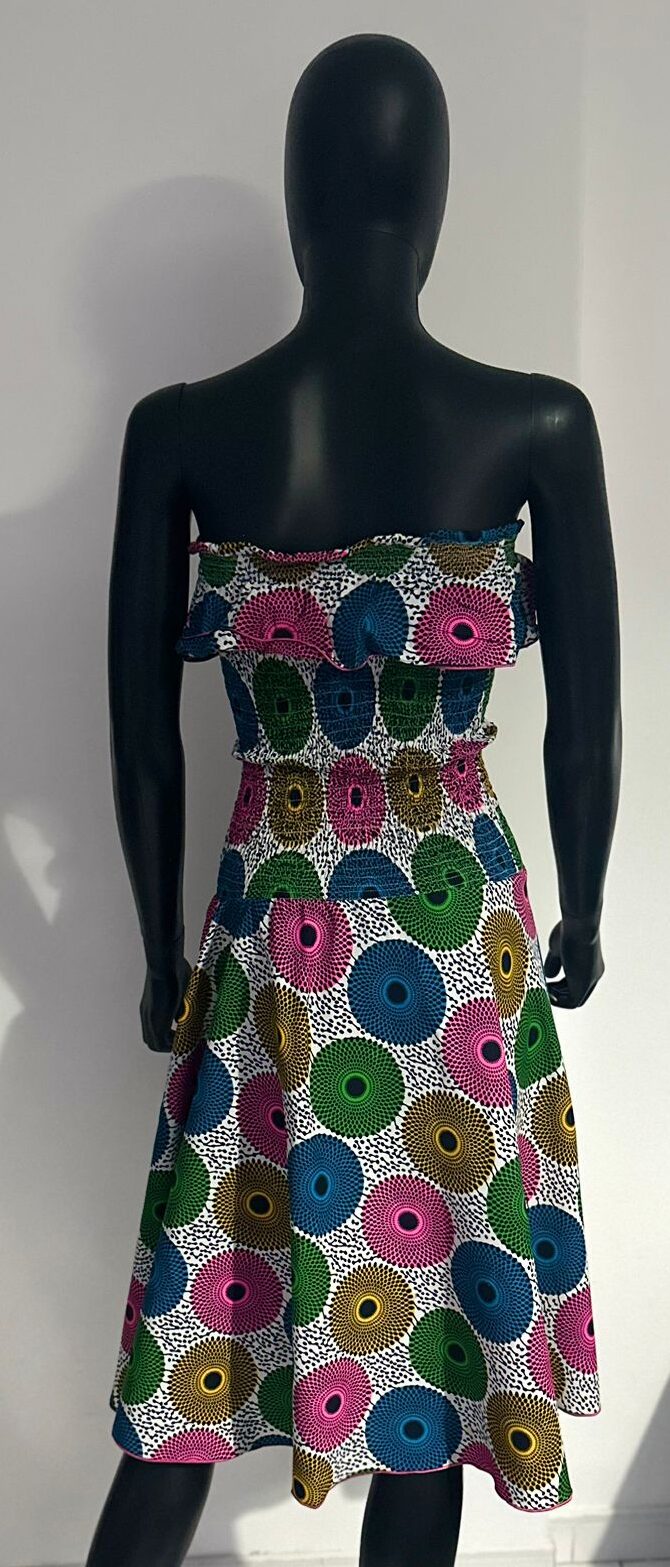 This strapless Ankara dress is a burst of color and charm, covered in playful circular patterns in green, pink, gold, and blue. The ruffled neckline adds a soft, feminine touch, while the structured bodice and flared skirt offer a flattering silhouette. An ideal choice for outdoor gatherings or summer celebrations.