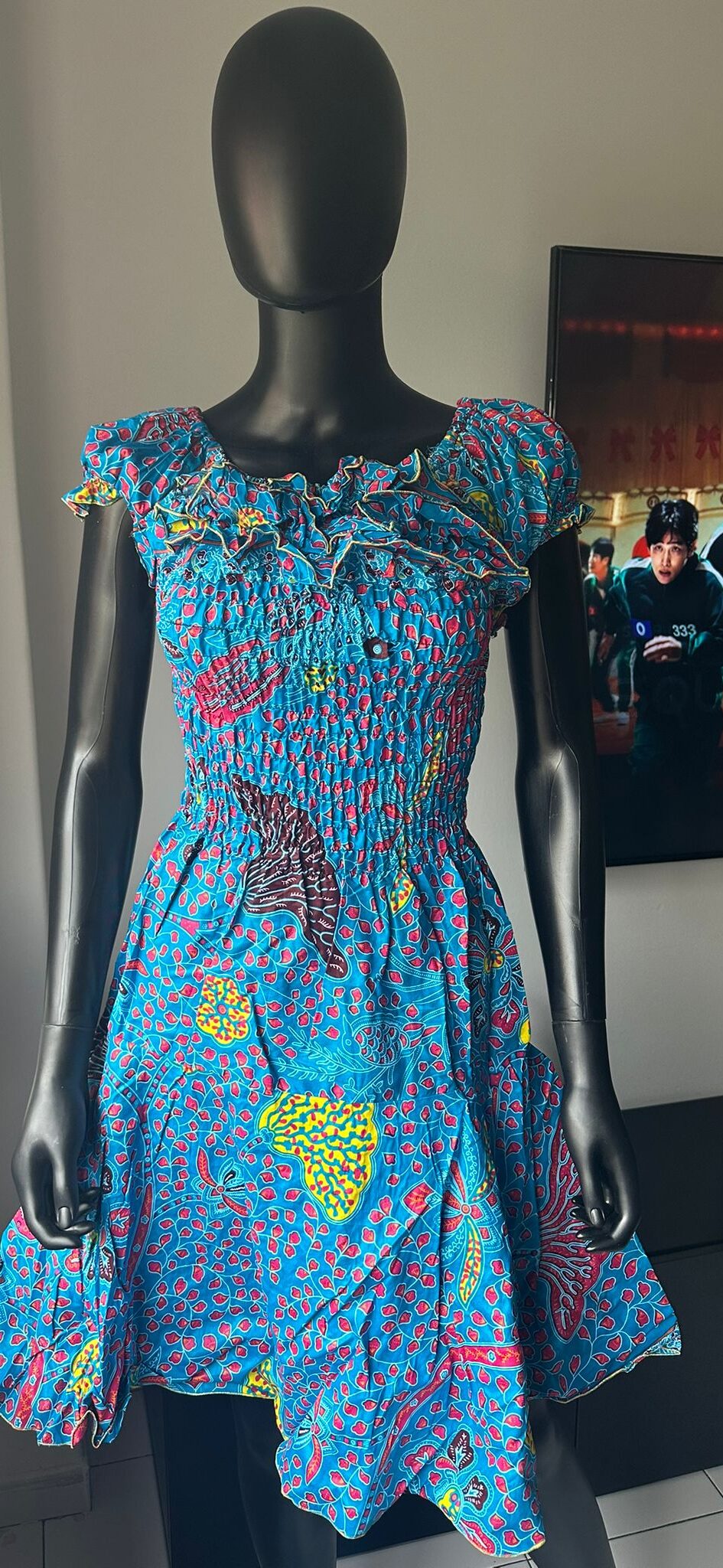 Turn heads in this eye-catching Ankara dress, crafted with charming cap sleeves and a fitted bodice that flares at the hips. The rich blue background bursts with abstract pink and yellow shapes, making it a cheerful addition to any wardrobe. Lightweight and breathable—ideal for sunny days or festive occasions.