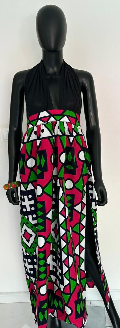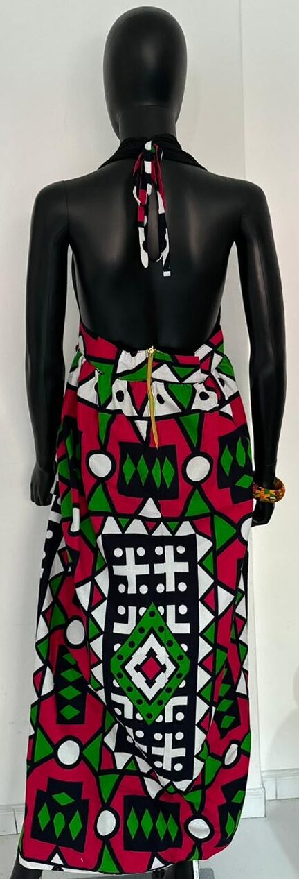 Celebrate culture and style with this stunning backless African print dress, featuring a striking combination of pink, green, black, and white geometric patterns. The halter neck design and flowing skirt create a flattering silhouette, while the open back adds a touch of allure. Bold colors and unique prints ensure you stand out in any crowd. Ideal for special events or casual outings, this dress effortlessly blends tradition with modern fashion.