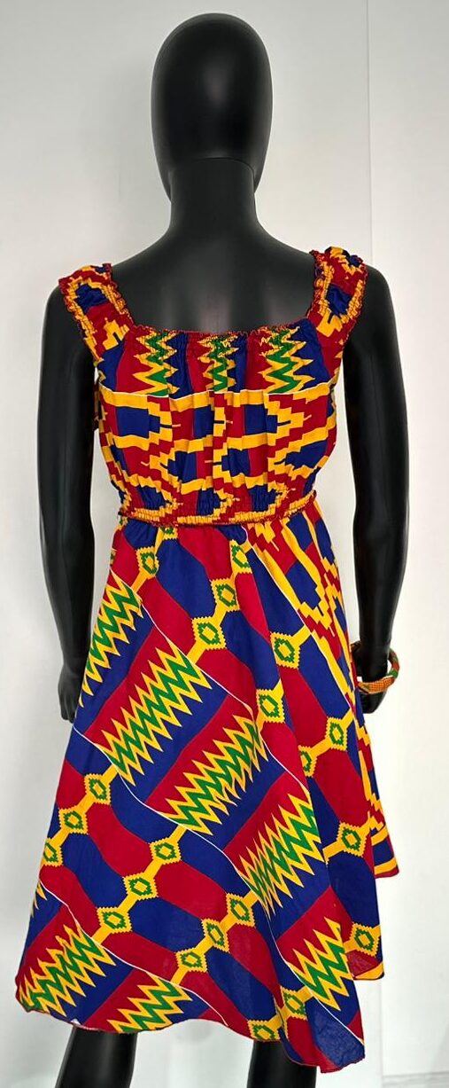 Step out in style with this eye-catching African print women’s dress. Crafted from breathable fabric, it features a vibrant mix of red, yellow, blue, and green geometric patterns that pay homage to traditional African design. The smocked bodice and ruffled straps add a feminine touch, while the flowing skirt offers comfort and elegance. Ideal for casual outings, cultural events, or summer gatherings, this dress combines tradition with modern flair effortlessly. Accessorize with matching jewelry or a simple bracelet for a complete look