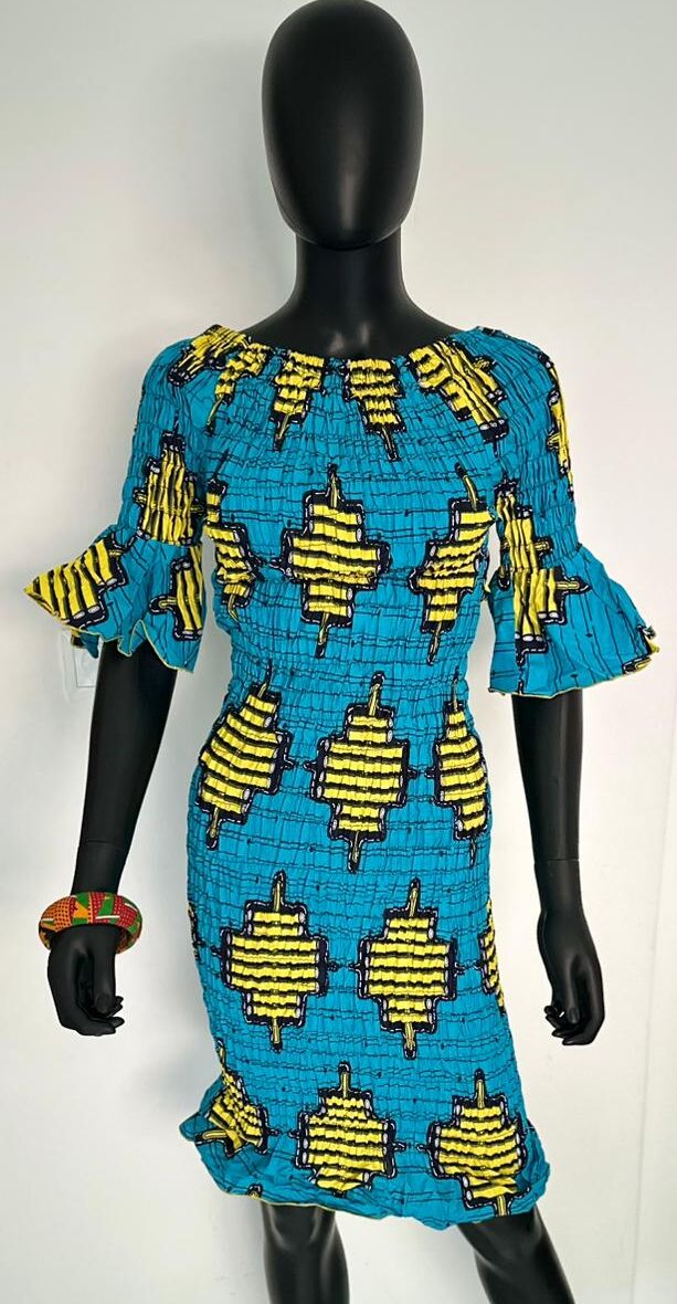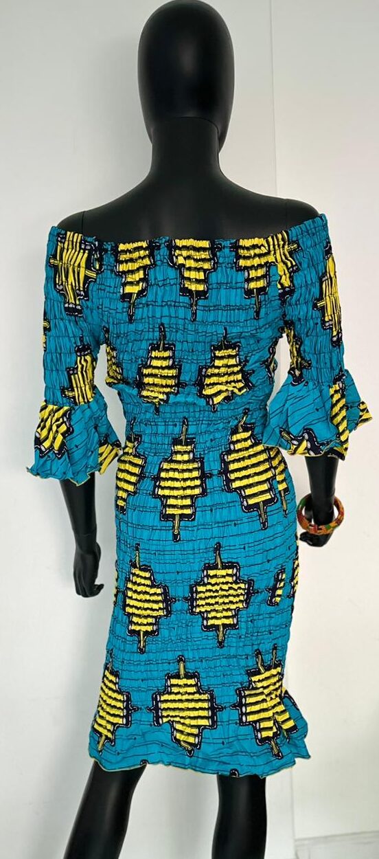 Make a statement in this stunning African print dress, designed with vibrant yellow and blue geometric patterns that celebrate rich cultural heritage. The off-shoulder neckline and ruched detailing create a flattering silhouette, while the elbow-length sleeves with subtle ruffles add a touch of femininity. Crafted for comfort and style, this dress is perfect for casual outings, special events, or anywhere you want to showcase bold, unique fashion. Embrace your individuality with this beautiful, eye-catching piece.