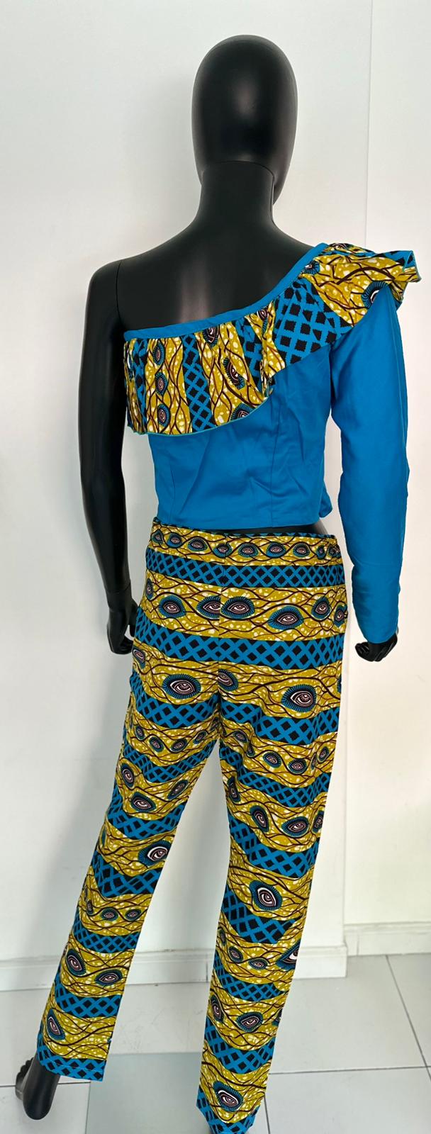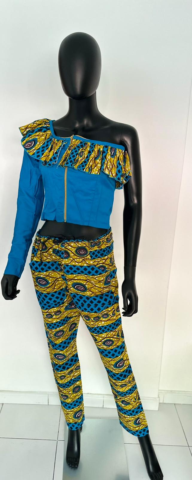 Make a bold fashion statement with this stunning two-piece set featuring a one-shoulder crop top and matching high-waisted pants. The top combines solid blue fabric with a vibrant yellow and blue patterned ruffle detail and a sleek front zipper, creating a unique and trendy silhouette. The pants showcase the same eye-catching pattern, offering a cohesive and stylish look perfect for any occasion. Crafted for comfort and style, this set is ideal for those who love to stand out with a modern twist on traditional prints.