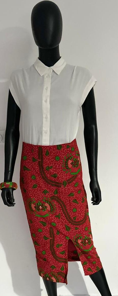 Elevate your style with this vibrant red midi skirt featuring a bold green and brown floral pattern. Designed with a front slit for ease and a flattering fit, this skirt is perfect for both casual and formal occasions.