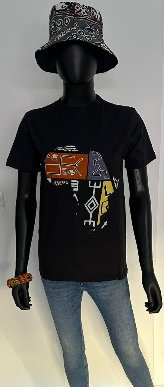 This bold black tee features a striking patchwork Africa map made of tribal-inspired symbols and earthy tones—perfect for cultural expression with everyday comfort