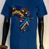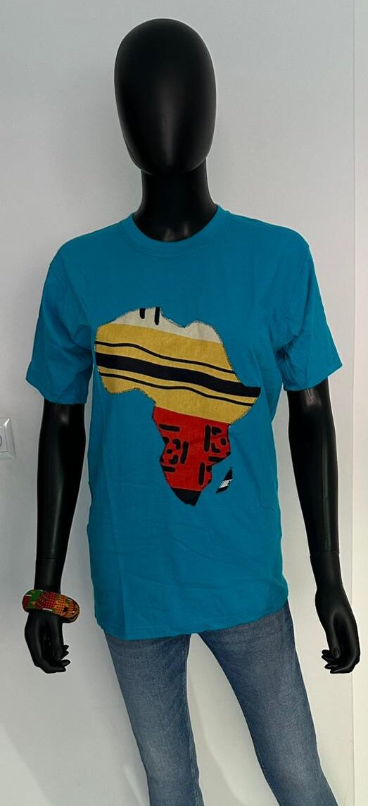 Bright and bold, this turquoise tee showcases a vibrant Africa map in traditional-inspired fabric—full of energy and cultural pride