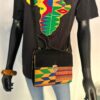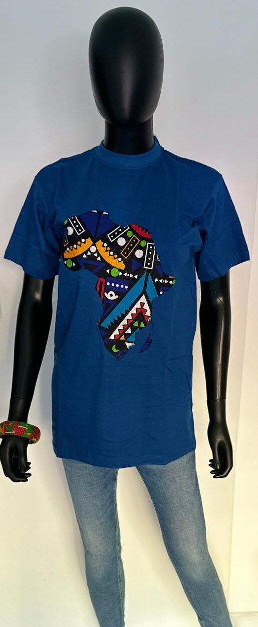 Turn heads in this royal blue T-shirt, proudly showcasing the silhouette of Africa filled with vibrant patchwork patterns. The fabric map bursts with colors—red, green, white, yellow, and blue—blended in tribal-inspired geometric shapes and designs. This unisex tee celebrates African identity through fashion, offering both comfort and cultural richness with its soft cotton feel and striking design