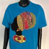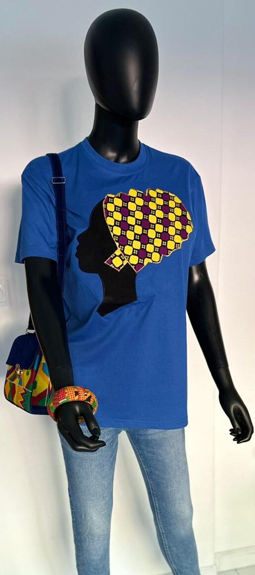 Express your culture with this royal blue t-shirt featuring a bold African woman silhouette, highlighted with authentic Ankara fabric for a stylish and meaningful look