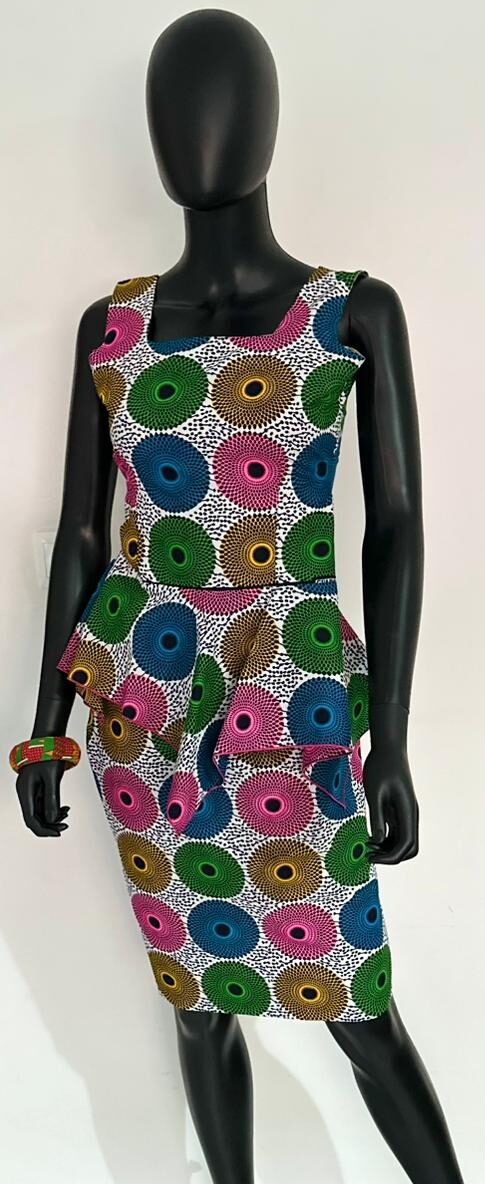 Make a vibrant statement with this matching set, featuring a sleeveless top and pencil skirt in a striking African print. The tailored fit and clean lines give it a professional edge with a bold twist