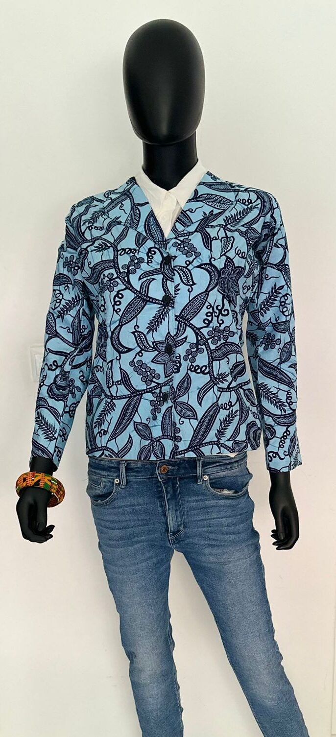 This bold and stylish women’s blazer features a striking sky-blue Ankara print with deep navy botanical patterns, bringing a modern twist to a classic silhouette. Its structured fit and clean lines make it perfect for smart-casual days, creative workspaces, or social gatherings where you want to stand out effortlessly. The look is paired with light-wash jeans for a relaxed contrast and finished with a cool bucket hat that adds just the right touch of flair. Whether dressed up or down, this blazer is a statement in both confidence and comfort.