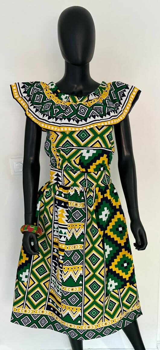 Elevate your style with this stunning, vibrant dress that effortlessly blends bold patterns with timeless elegance. Featuring a striking mix of green, yellow, black, and white geometric designs, this dress showcases a flattering fitted waist and a charming ruffled neckline that adds a touch of sophistication. Perfect for any occasion, its lively colors and intricate patterns make it a true statement piece that radiates confidence and grace. Embrace beauty and elegance in every step you take.